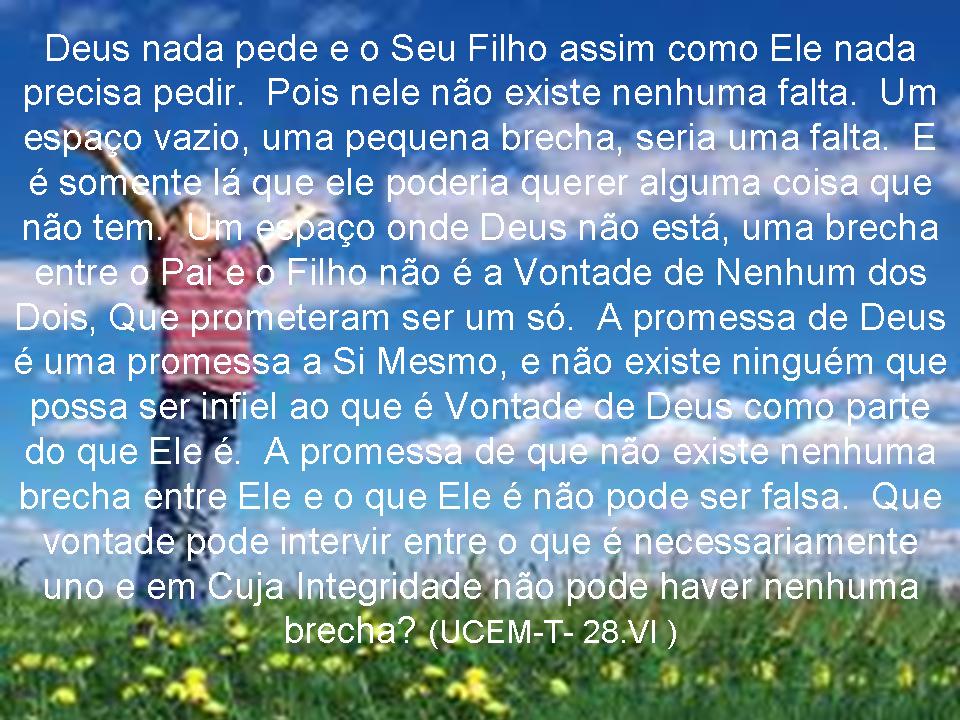 A EXPIAÇÃO COMO DEFESA Nada que não venha de Deus tem a capacidade de me afetar. Nada tem o poder de me ferir. O que eu tenho valorizado que contraria este pensamento? Quais são os meus medos? Por que ter medo de não ser bom o bastante ou de ser rejeitado ou pouco valorizado, se o próprio Deus habita em mim? Deus é o meu sustento. Ele é a minha Causa e eu sou seu efeito. Eu sou como Deus me criou. Este pensamento me protege. Nenhum erro tem o poder de abalar a paz. Desfazer erros e não investir no medo são condições que me trarão a consciência de que estou em segurança. Quais são os meus tesouros e quanto eu os tenho valorizado? O que tenho medo de perder quando é impossível perder o que é real? A expiação vem para desfazer cada um dos pensamentos equivocados sobre a minha identidade. Ela desfaz os erros passados construindo a ponte de retorno à Realidade.